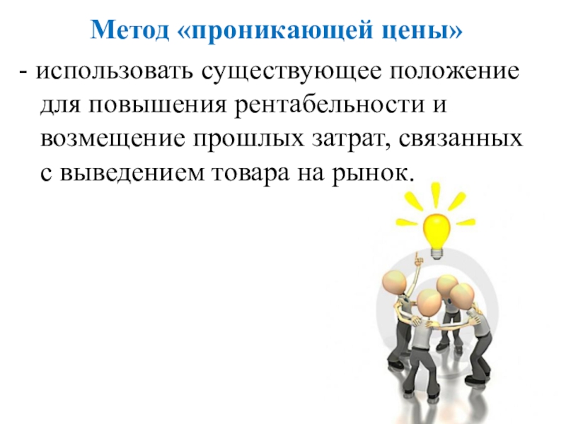 Метод «проникающей цены»- использовать существующее положение для повышения рентабельности и возмещение прошлых затрат, связанных с выведением товара