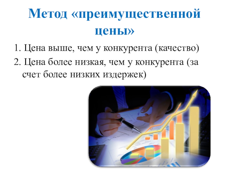 Метод «преимущественной цены»1. Цена выше, чем у конкурента (качество)2. Цена более низкая, чем у конкурента (за счет