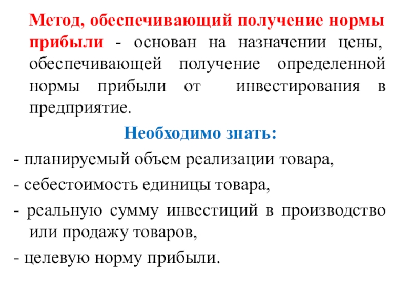 Слайд 7 Метод, обеспечивающий получение нормы прибыли - основан на назначении