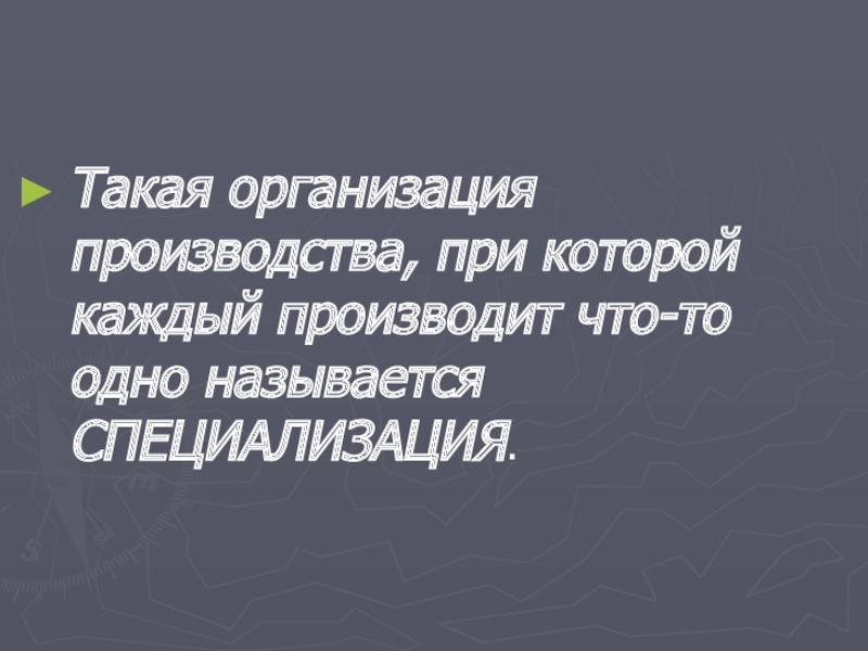 Такая организация производства, при которой каждый производит что-то одно называется СПЕЦИАЛИЗАЦИЯ.