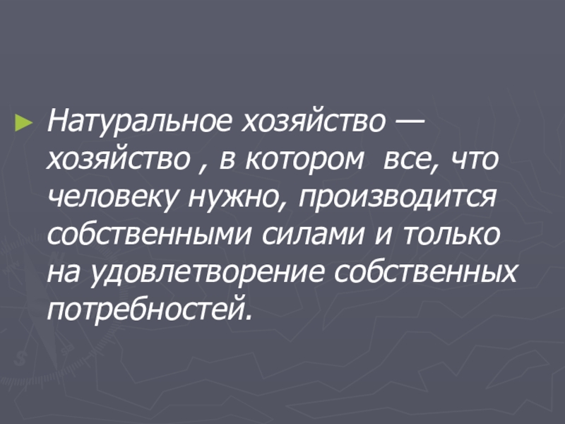 Натуральное хозяйство —хозяйство , в котором все, что человеку нужно, производится собственными силами и только на удовлетворение собственных