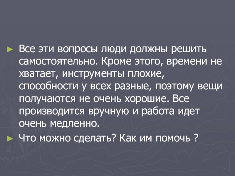 Все эти вопросы люди должны решить самостоятельно. Кроме этого, времени не хватает, инструменты плохие, способности у всех