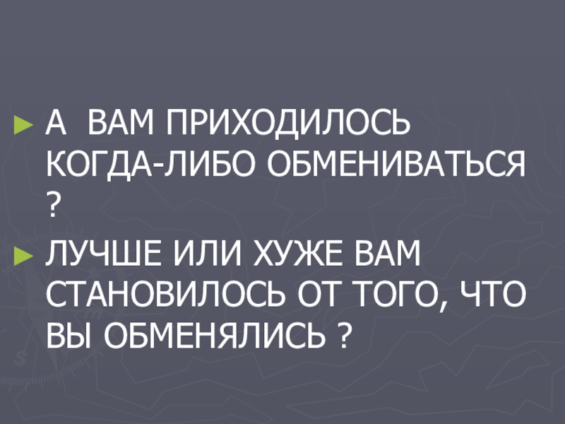 А ВАМ ПРИХОДИЛОСЬ КОГДА-ЛИБО ОБМЕНИВАТЬСЯ ?ЛУЧШЕ ИЛИ ХУЖЕ ВАМ СТАНОВИЛОСЬ ОТ ТОГО, ЧТО ВЫ ОБМЕНЯЛИСЬ ?