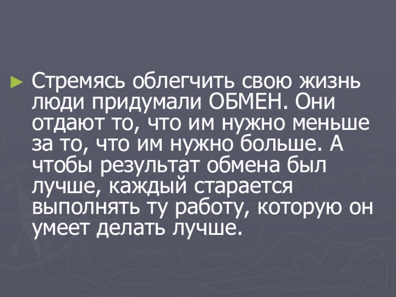 Стремясь облегчить свою жизнь люди придумали ОБМЕН. Они отдают то, что