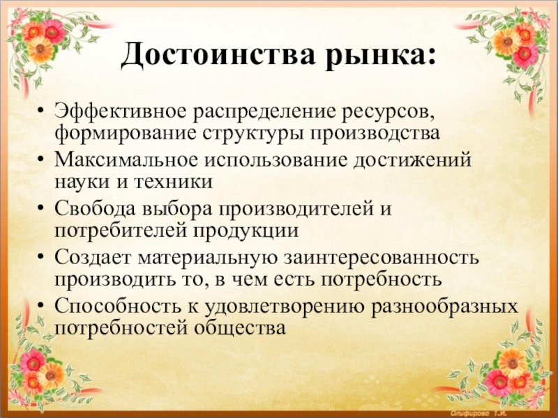 Слайд 9Достоинства рынка: