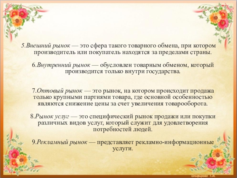 6.Внутренний рынок — обусловлен товарным обменом, который производится только внутри государства.