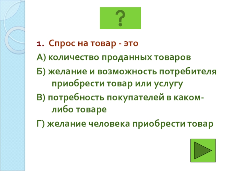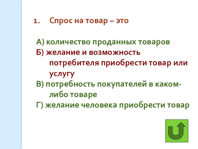 Спрос – это сложившаяся в определенный период времени зависимость величин спроса на данном товарном рынке от цен, по которым товары могут быть предложены к продаже.
