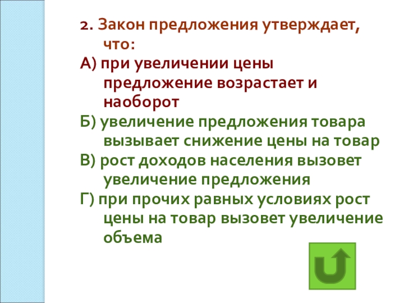 Г) при прочих равных условиях рост цены на товар вызовет увеличение объема