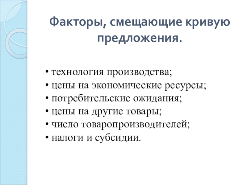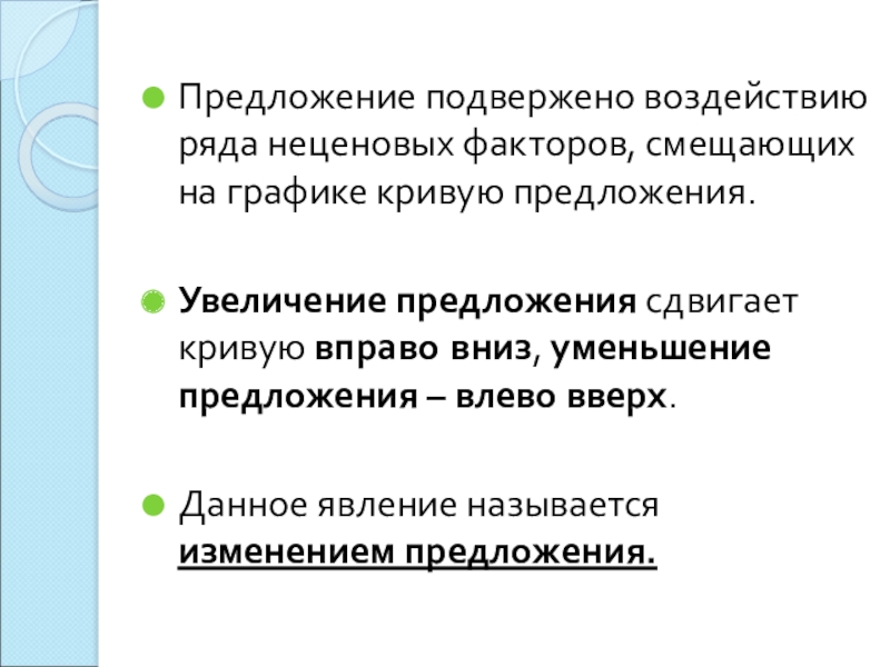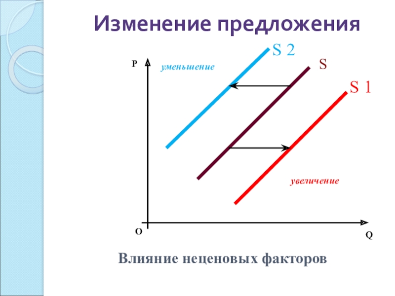 Слайд 17Предложение подвержено воздействию ряда неценовых факторов, смещающих на графике кривую предложения.