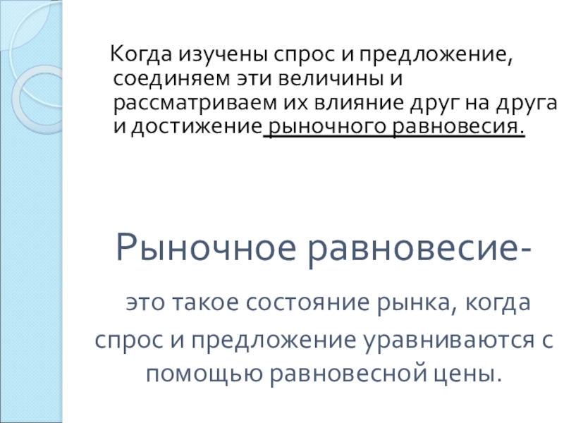 Когда изучены спрос и предложение, соединяем эти величины и рассматриваем их влияние друг на друга и достижение рыночного равновесия.