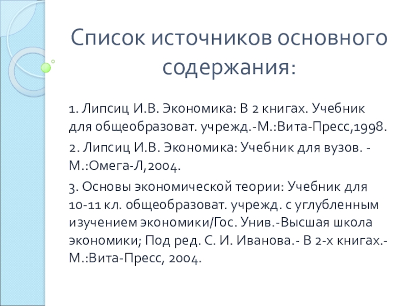 2. Липсиц И.В. Экономика: Учебник для вузов. - М.:Омега-Л,2004.