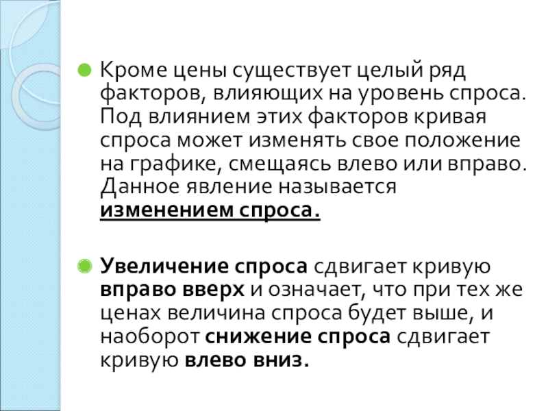 Слайд 7Кроме цены существует целый ряд факторов, влияющих на уровень спроса. Под