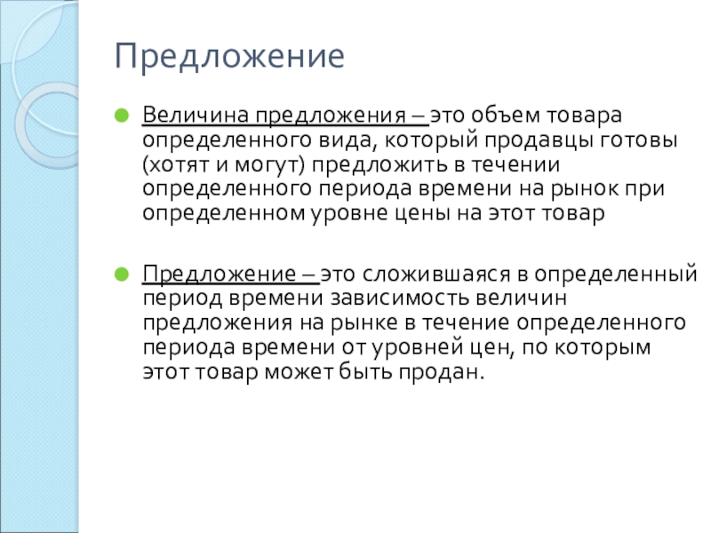 Предложение – это сложившаяся в определенный период времени зависимость величин предложения на рынке в течение определенного периода времени от уровней цен, по которым этот товар может быть продан.