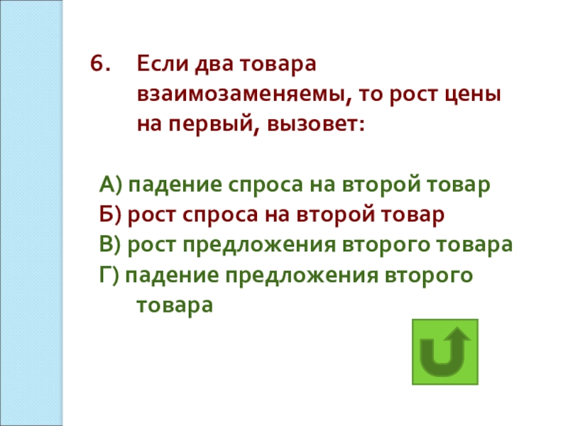 Слайд 33Если два товара взаимозаменяемы, то рост цены на первый, вызовет: