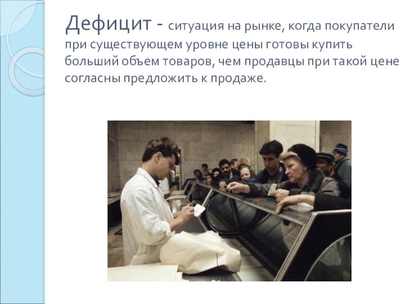 Слайд 40Дефицит - ситуация на рынке, когда покупатели при существующем уровне цены