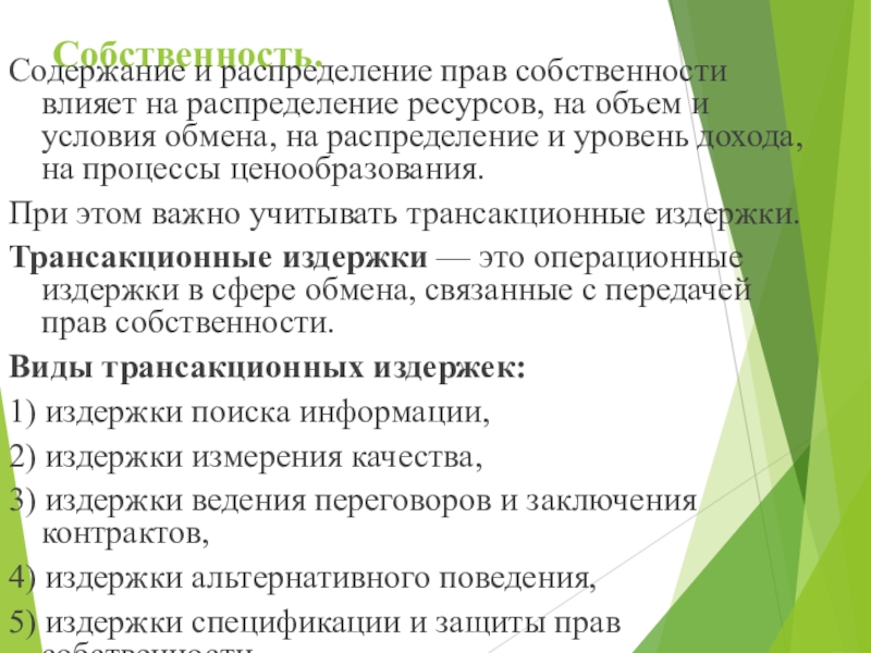 Содержание и распределение прав собственности влияет на распределение ресурсов, на объем