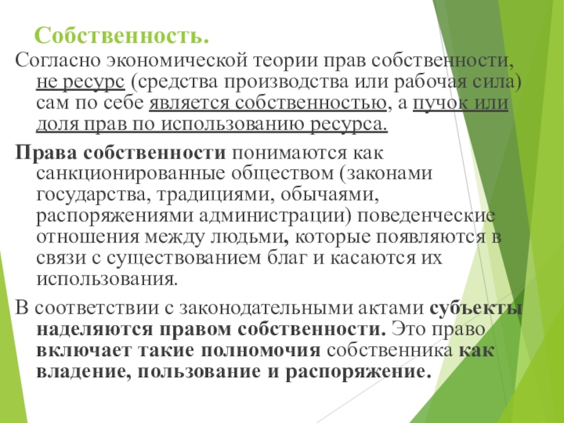 Права собственности понимаются как санкционированные обществом (законами государства, традициями, обычаями, распоряжениями администрации) поведенческие отношения между людьми, которые появляются в связи с существованием благ и касаются их использования.