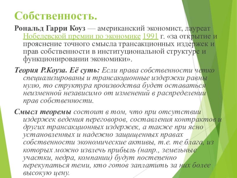 Теория Р.Коуза. Её суть: Если права собственности четко специализированы и трансакционные издержки равны нулю, то структура производства будет оставаться неизменной независимо от изменений в распределении прав собственности.