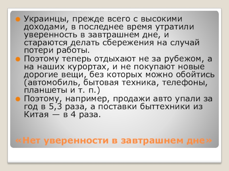 Поэтому теперь отдыхают не за рубежом, а на наших курортах, и не покупают новые дорогие вещи, без которых можно обойтись (автомобиль, бытовая техника, телефоны, планшеты и т. п.)