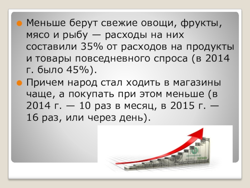 Причем народ стал ходить в магазины чаще, а покупать при этом меньше (в 2014 г. — 10 раз в месяц, в 2015 г. — 16 раз, или через день).