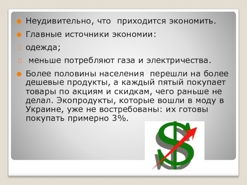 половины населения перешли на более дешевые продукты, а каждый пятый покупает товары по акциям и скидкам, чего раньше не делал. Экопродукты, которые вошли в моду в Украине, уже не востребованы: их готовы покупать примерно 3%.