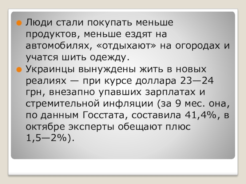 Украинцы вынуждены жить в новых реалиях — при курсе доллара 23—24 грн, внезапно упавших зарплатах и стремительной инфляции (за 9 мес. она, по данным Госстата, составила 41,4%, в октябре эксперты обещают плюс 1,5—2%).