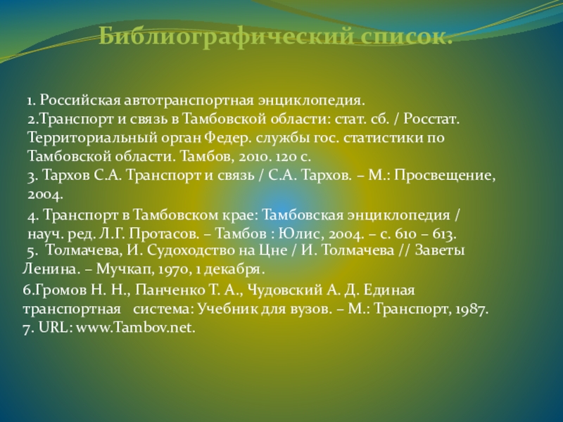 4. Транспорт в Тамбовском крае: Тамбовская энциклопедия / науч. ред. Л.Г. Протасов. – Тамбов : Юлис, 2004. – с. 610 – 613.