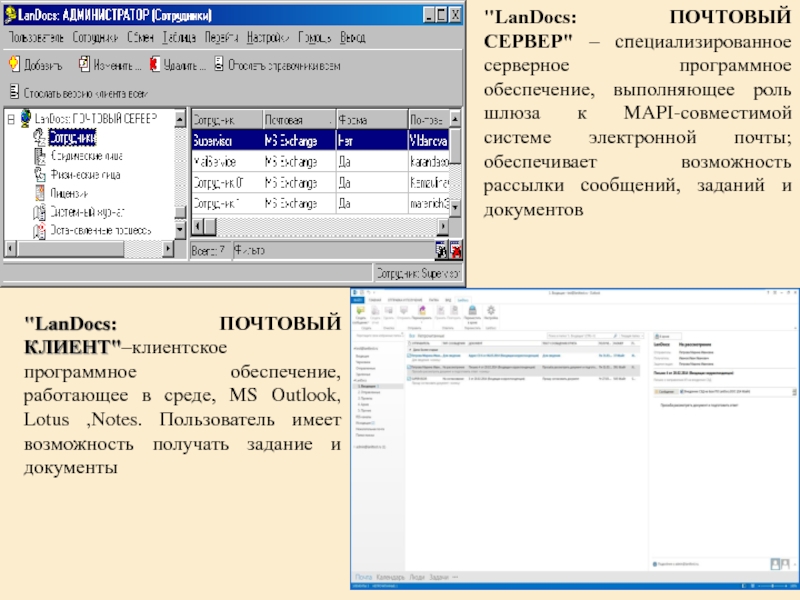 "LanDocs: ПОЧТОВЫЙ КЛИЕНТ"–клиентское программное обеспечение, работающее в среде, MS Outlook, Lotus ,Notes. Пользователь имеет возможность получать задание и документы