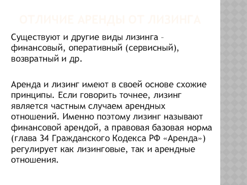 Аренда и лизинг имеют в своей основе схожие принципы. Если говорить точнее, лизинг является частным случаем арендных отношений. Именно поэтому лизинг называют финансовой арендой, а правовая базовая норма (глава 34 Гражданского Кодекса РФ «Аренда») регулирует как лизинговые, так и арендные отношения.