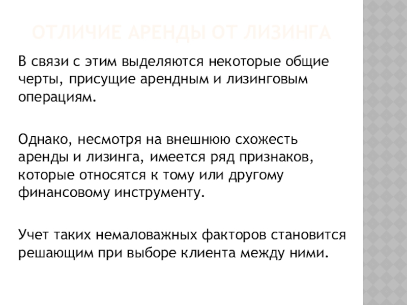 Однако, несмотря на внешнюю схожесть аренды и лизинга, имеется ряд признаков, которые относятся к тому или другому финансовому инструменту.