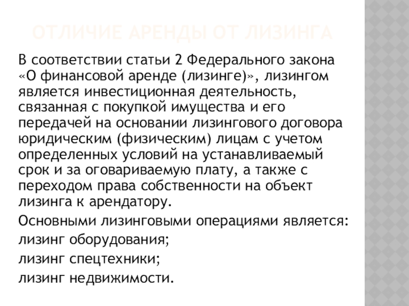 аренде (лизинге)», лизингом является инвестиционная деятельность, связанная с покупкой имущества и его передачей на основании лизингового договора юридическим (физическим) лицам с учетом определенных условий на устанавливаемый срок и за оговариваемую плату, а также с переходом права собственности на объект лизинга к арендатору.