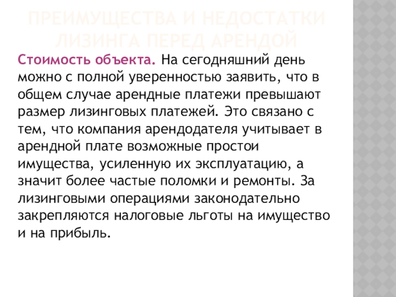 Слайд 23Преимущества и недостатки лизинга перед арендой