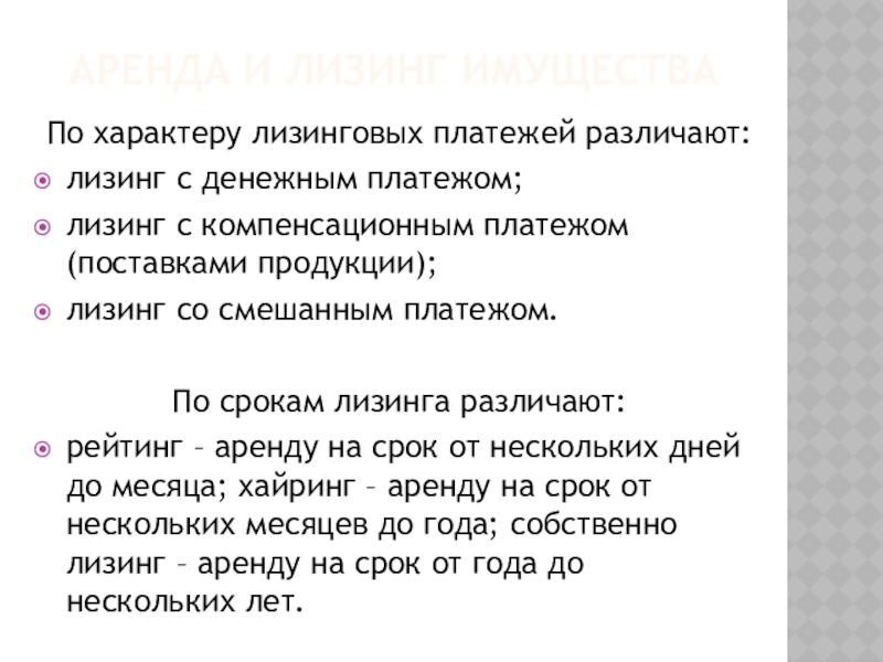 рейтинг – аренду на срок от нескольких дней до месяца; хайринг – аренду на срок от нескольких месяцев до года; собственно лизинг – аренду на срок от года до нескольких лет.
