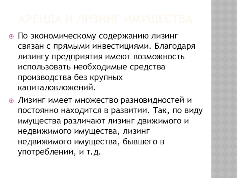 По экономическому содержанию лизинг связан с прямыми инвестициями.