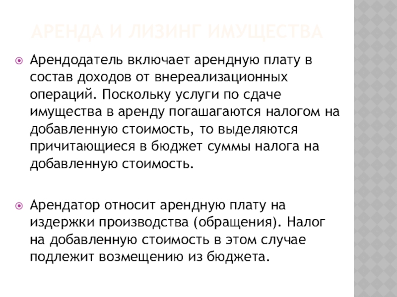 внереализационных операций. Поскольку услуги по сдаче имущества в аренду погашагаются налогом на добавленную стоимость, то выделяются причитающиеся в бюджет суммы налога на добавленную стоимость.