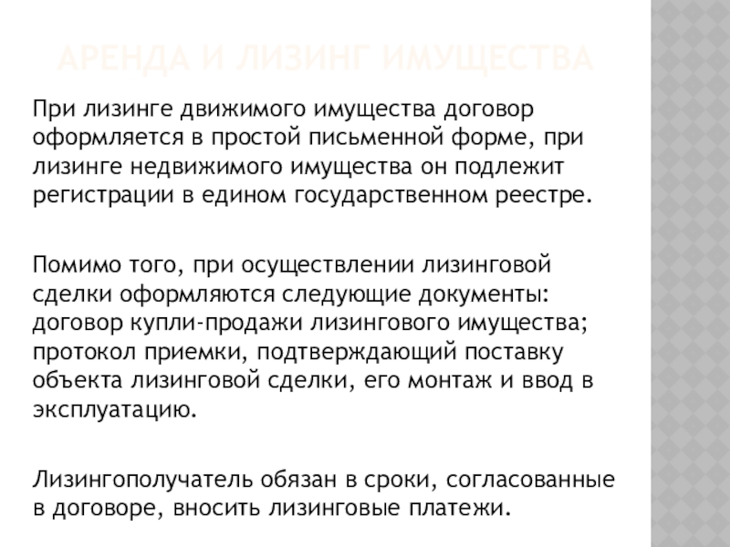 Лизингополучатель обязан в сроки, согласованные в договоре, вносить лизинговые платежи.