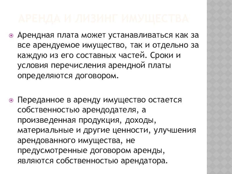 имущество, так и отдельно за каждую из его составных частей. Сроки и условия перечисления арендной платы определяются договором.