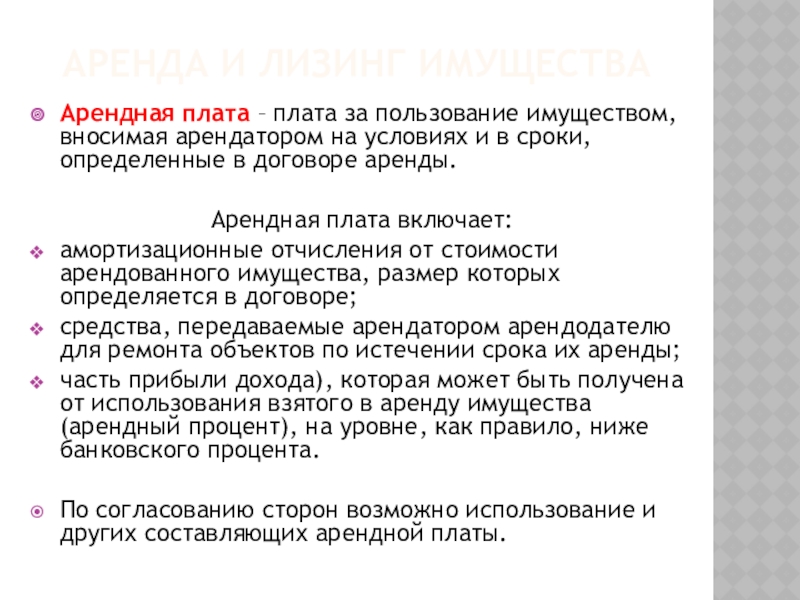 часть прибыли дохода), которая может быть получена от использования взятого в аренду имущества (арендный процент), на уровне, как правило, ниже банковского процента.