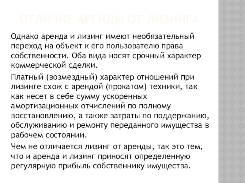 Чем не отличается лизинг от аренды, так это тем, что и аренда и лизинг приносят определенную регулярную прибыль собственнику имущества.