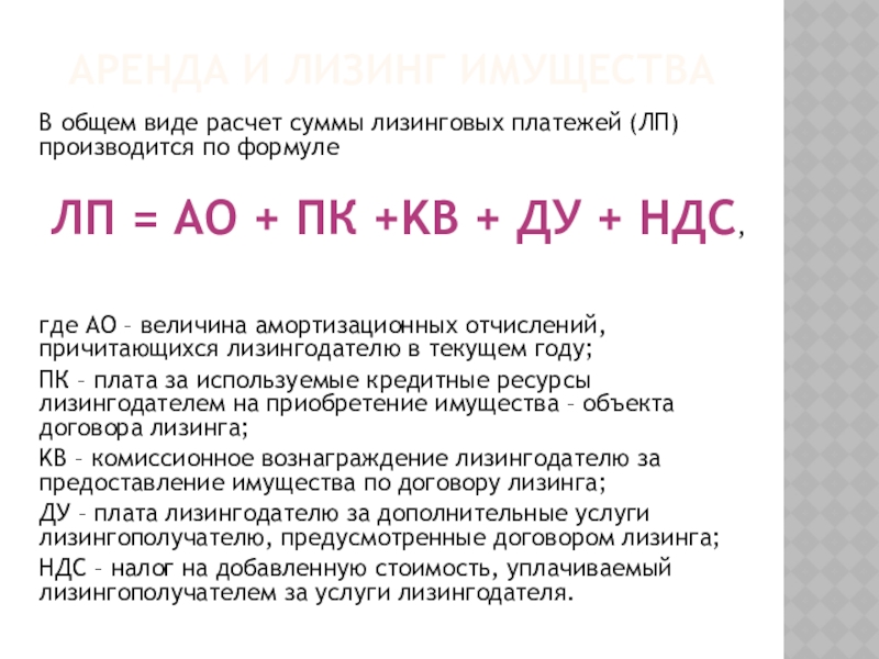 В общем виде расчет суммы лизинговых платежей (ЛП)