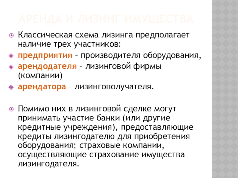 Помимо них в лизинговой сделке могут принимать участие банки (или другие кредитные учреждения), предоставляющие кредиты лизингодателю для приобретения оборудования; страховые компании, осуществляющие страхование имущества лизингодателя.