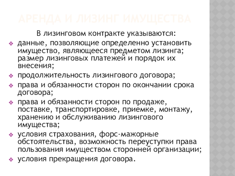 являющееся предметом лизинга; размер лизинговых платежей и порядок их внесения;