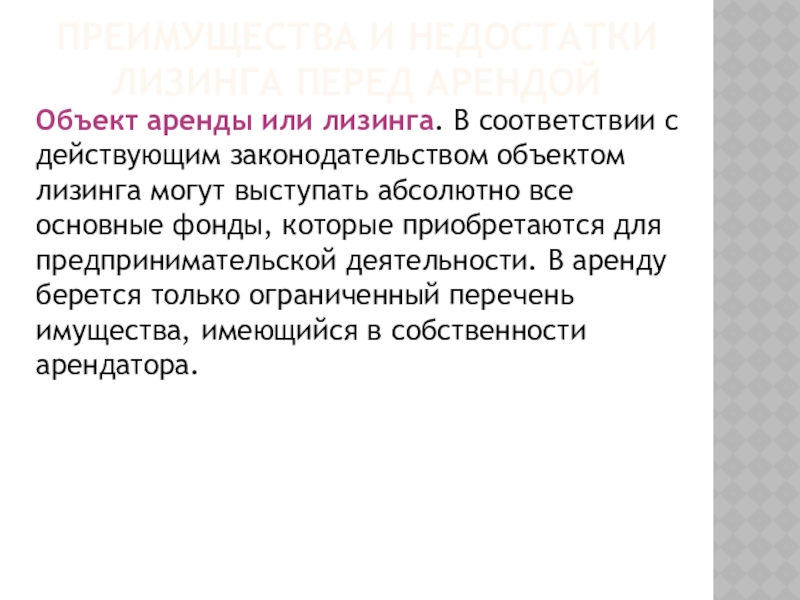 с действующим законодательством объектом лизинга могут выступать абсолютно все основные фонды, которые приобретаются для предпринимательской деятельности. В аренду берется только ограниченный перечень имущества, имеющийся в собственности арендатора.
