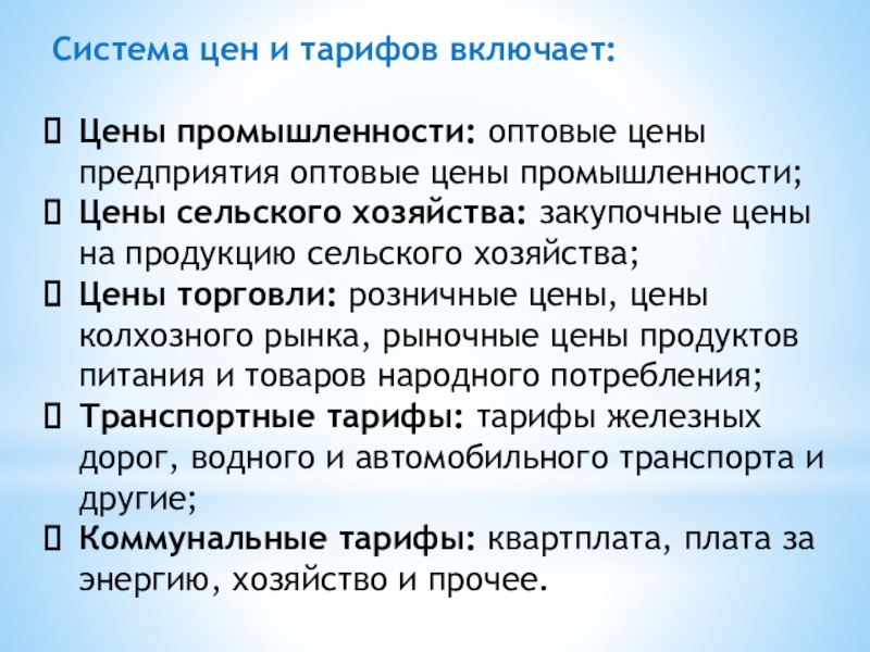 Транспортные тарифы: тарифы железных дорог, водного и автомобильного транспорта и другие;