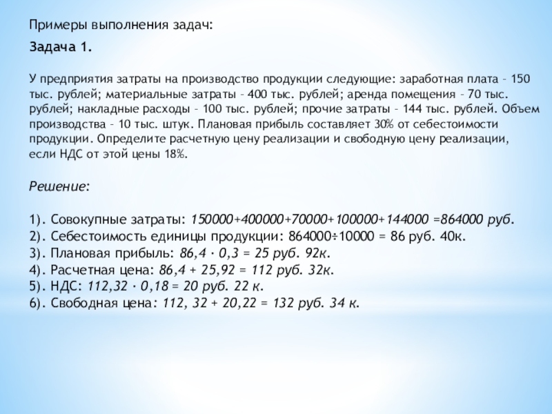 плата – 150 тыс. рублей; материальные затраты – 400 тыс. рублей; аренда помещения – 70 тыс. рублей; накладные расходы – 100 тыс. рублей; прочие затраты – 144 тыс. рублей. Объем производства – 10 тыс. штук. Плановая прибыль составляет 30% от себестоимости продукции. Определите расчетную цену реализации и свободную цену реализации, если НДС от этой цены 18%.