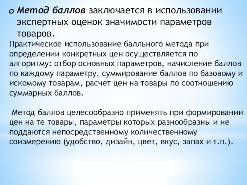 использование балльного метода при определении конкретных цен осуществляется по алгоритму: отбор основных параметров, начисление баллов по каждому параметру, суммирование баллов по базовому и искомому товарам, расчет цен на товары по соотношению суммарных баллов.