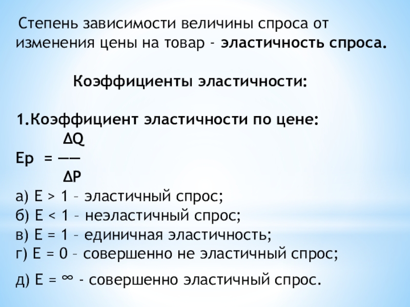 Слайд 7 Степень зависимости величины спроса от изменения цены на товар -