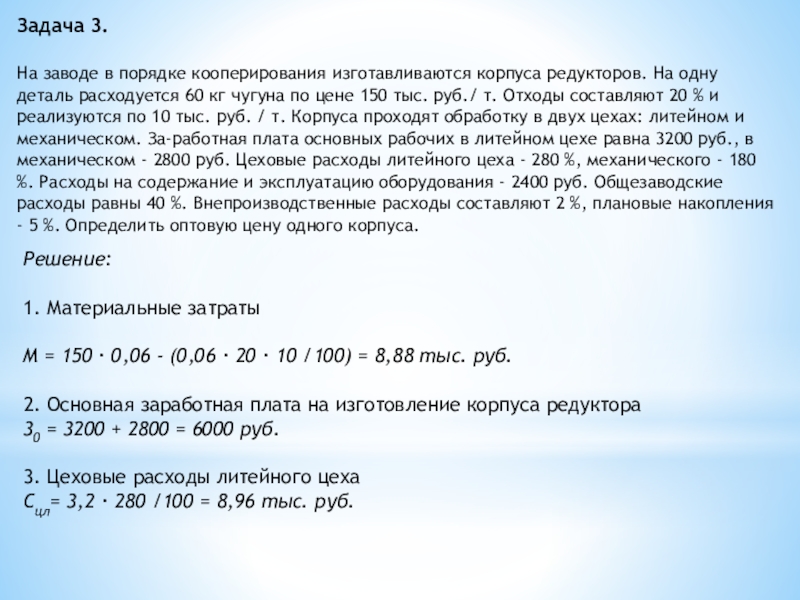 деталь расходуется 60 кг чугуна по цене 150 тыс. руб./ т. Отходы составляют 20 % и реализуются по 10 тыс. руб. / т. Корпуса проходят обработку в двух цехах: литейном и механическом. За-работная плата основных рабочих в литейном цехе равна 3200 руб., в механическом - 2800 руб. Цеховые расходы литейного цеха - 280 %, механического - 180 %. Расходы на содержание и эксплуатацию оборудования - 2400 руб. Общезаводские расходы равны 40 %. Внепроизводственные расходы составляют 2 %, плановые накопления - 5 %. Определить оптовую цену одного корпуса.