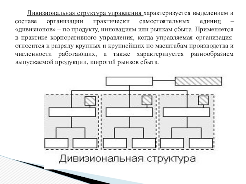 Слайд 10Дивизиональная структура управления характеризуется выделением в составе организации практически самостоятельных единиц