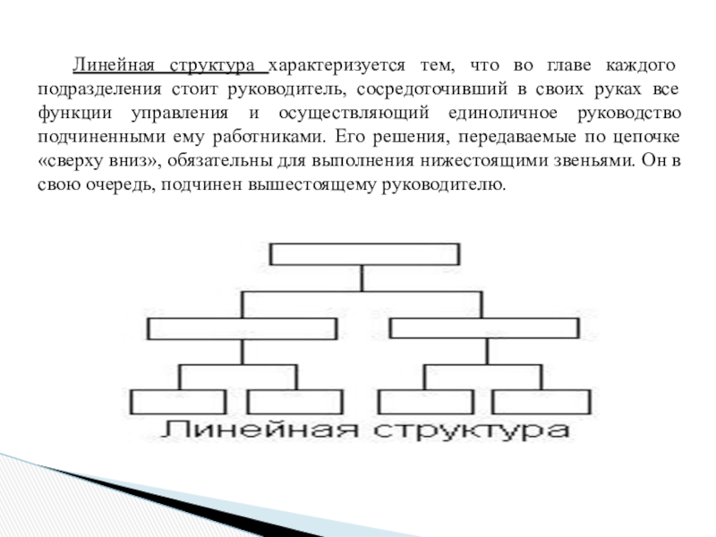 Слайд 6Линейная структура характеризуется тем, что во главе каждого подразделения стоит руководитель,